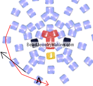 Add two white beads on the bottom (black) string, crisscross the top (red) string through the last bead added. Continue to pass the black string (the one you just used to add new beads on) through one old bead from step 2 (marked A).