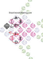Add two 4mm crystal bicones, continue to pass this same string back down old 4mm crystals marked D, E and F.