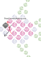 - Repeat the above for the bottom string - Add four 4mm crystal bicones on the bottom (red) string and cross the same string back up through the first crystal added in this step (shown where the string crisscrosses).