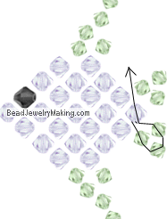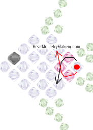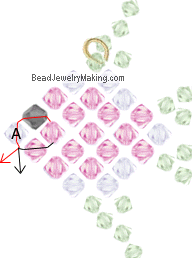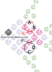 Add two 4mm crystal bicones, continue to pass this same string back up old 4mm crystals marked A, B and C.