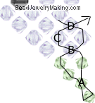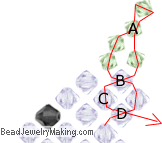 Continue to pass this same string up the third 3mm crystal you just added (marked A) Continue to add one 3mm crystal bicone and continue to pass the string up through three old 4mm crystals marked B, C and D.
