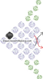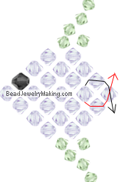 - Add four 4mm crystal bicones on the top (black) string and cross the same string back down through the first crystal added in this step (shown where the string crisscrosses).
